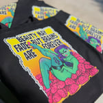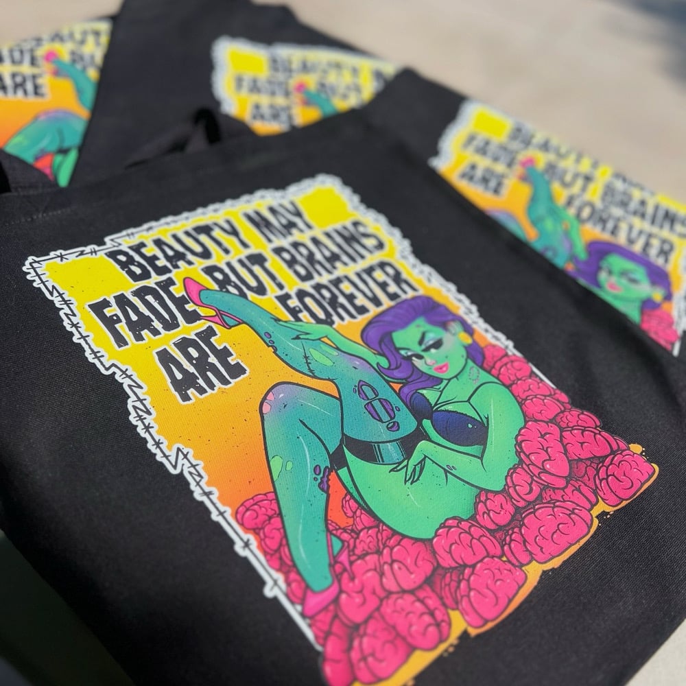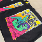 100% Cotton black tote bag. Measures 15"W x 16"H, 21" Handles.