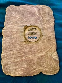 This wooden print measures 9.5 x 6.5. It is hand painted and numbered. Limited to only 10 prints.